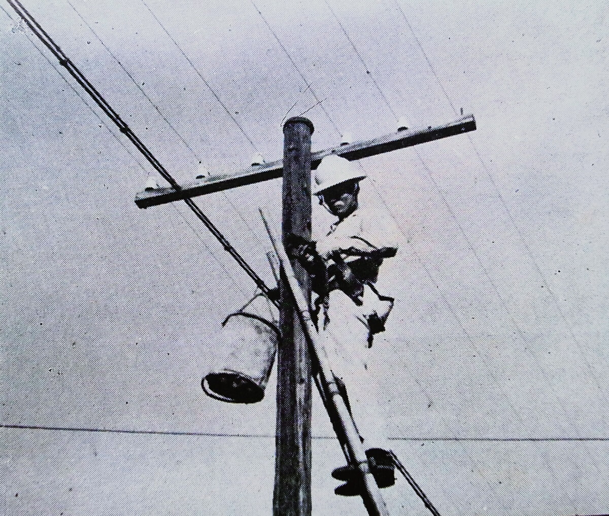 ▲架設長途架空明線,有時需要好幾個人同時在電線桿上相互協助。